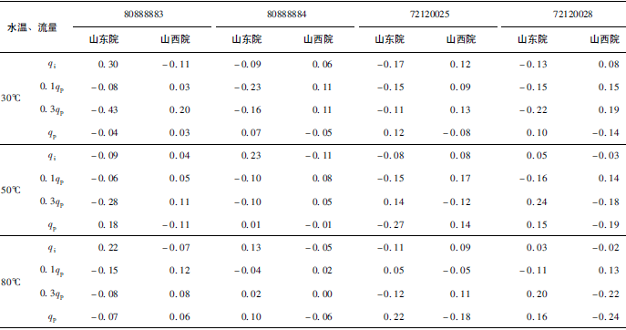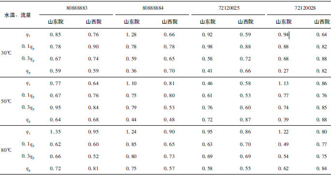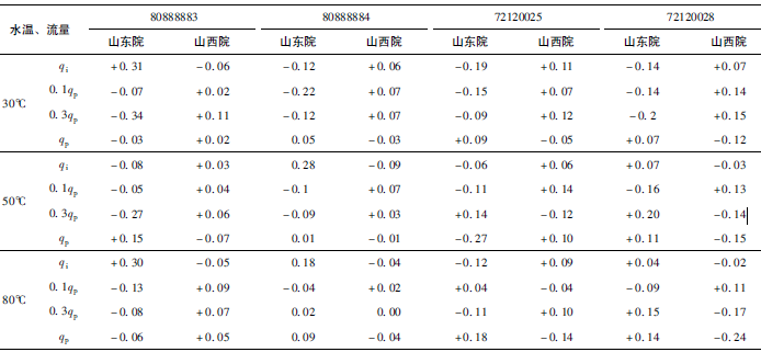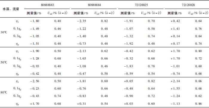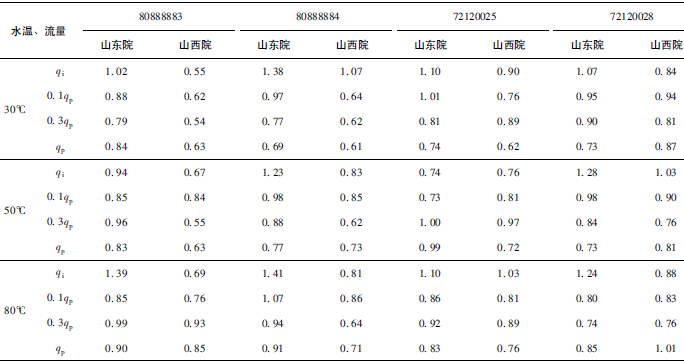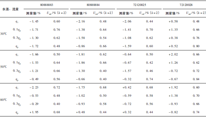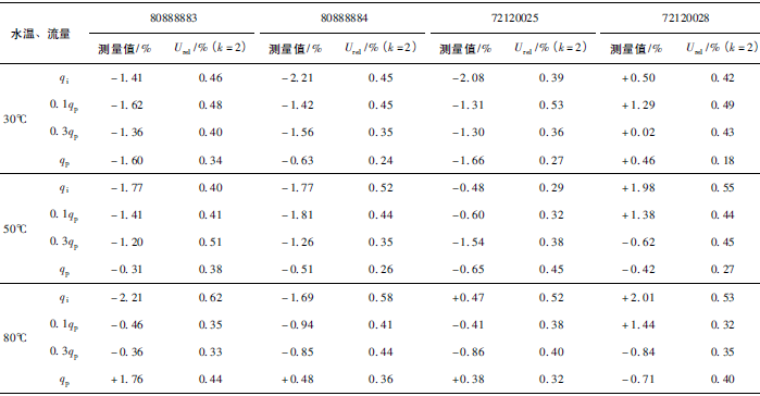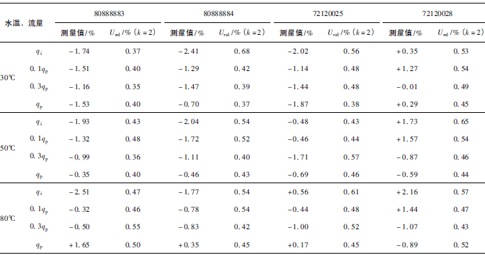 (3)累積體積(標(biāo)準(zhǔn)表法)相對(duì)示值誤差測(cè)量結(jié)果中,山東院在水溫30℃、qi點(diǎn)處與參考值的差值最大,為+0.31%(80888883);山西院在水溫80℃、qp點(diǎn)處與參考值的差值最大,為-0.24%(72120028)。同樣在標(biāo)準(zhǔn)表法中比對(duì)樣品在一些試驗(yàn)點(diǎn)上的測(cè)量重復(fù)性也不是很好,差值的擴(kuò)展不確定度最大達(dá)到了1.41%。