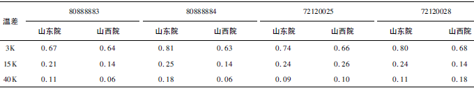 (1)熱量相對(duì)示值誤差測(cè)量結(jié)果中,兩院在15K點(diǎn)處與參考值的差值最大,山東院為+0.17K(72120028);山西院為+0.13K(72120025)。由于3K溫差對(duì)相對(duì)誤差來(lái)說(shuō)要求較高,所以差值的擴(kuò)展不確定度也較大,為0.63%~0.81%。