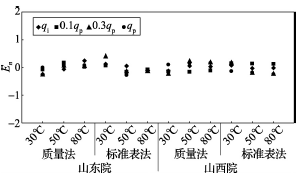 (2)累積體積(質(zhì)量法)相對(duì)示值誤差測(cè)量結(jié)果中,山東院在水溫80℃、qi點(diǎn)處與參考值的差值最大,為+0.31%(72120025);山西院在水溫30℃、0.3qp點(diǎn)處與參考值的差值最大,為+0.36%(72120028)。由于比對(duì)樣品在一些試驗(yàn)點(diǎn)上的測(cè)量重復(fù)性不是很好,差值的擴(kuò)展不確定度最大達(dá)到了1.35%。