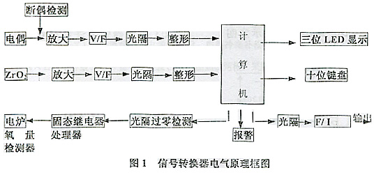 將來自氧量檢測器的模擬信號(氧勢、熱電勢)分別調(diào)制成0-10KNz調(diào)頻信號,經(jīng)光電隔離后送至計算機,采用調(diào)頻方式能將儀表輸入、輸出相互隔離,這樣就消除了諸如大電流跳變所引起的干擾,能夠克服高共模電壓,因而大大提高了儀表的抗干擾能力。應用程序主要由主程序和子程序組成,所有的程序都采用模塊結構編制,便于修改、增加軟件功能,以滿足不同用戶的特殊需要。程序運算采用了三位浮點數(shù),保證了運算勞動精度,對氧濃、爐溫的計算,采用查表線性插值法,對爐溫的控制采用增量式PID算式控制。信號轉(zhuǎn)換器的電氣原理框圖見圖1