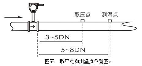 3、取壓點(diǎn)和測溫點(diǎn),應(yīng)分別在傳感器的下游3~5DN處和6~8DN處(見圖五)。