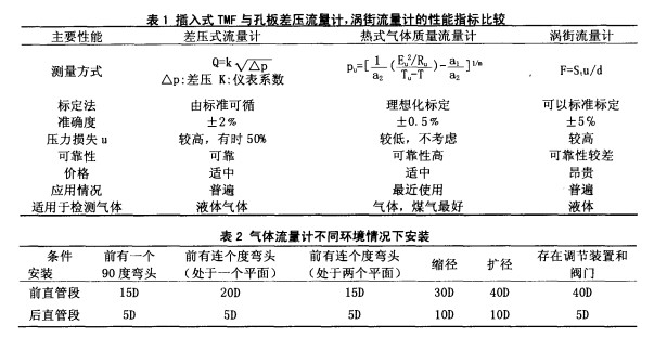 5大管徑流量儀表的比較插入式TMF、孔板式差壓流量計兩者均能檢測 大管徑流量 ,我們可以作一 比較 ,由表i中明顯看出大管徑插入式熱式氣體質量流量計在各項性能 指標有很大的優(yōu)勢,因此它是差壓式流量計的替代品。氣體流量計根據(jù)具體的環(huán)境情況的安裝見表 2。