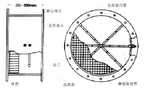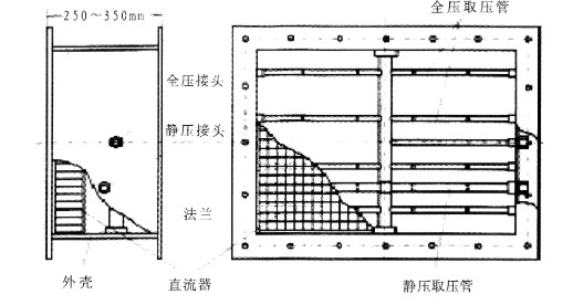 由圖可以看出,該裝置不管管道截面積多大,其長(zhǎng)度都在250-300mm之間。在該裝置的入口端是布滿整個(gè)截面積的直流器,擾動(dòng)的氣流經(jīng)過(guò)直流器的整流,變成平穩(wěn)的氣流。在直流器之后,裝有在管道橫截面上按一定規(guī)律排列的橫截面速度取壓管,將流速不相同的動(dòng)壓經(jīng)裝置變成較平穩(wěn)的信號(hào)。