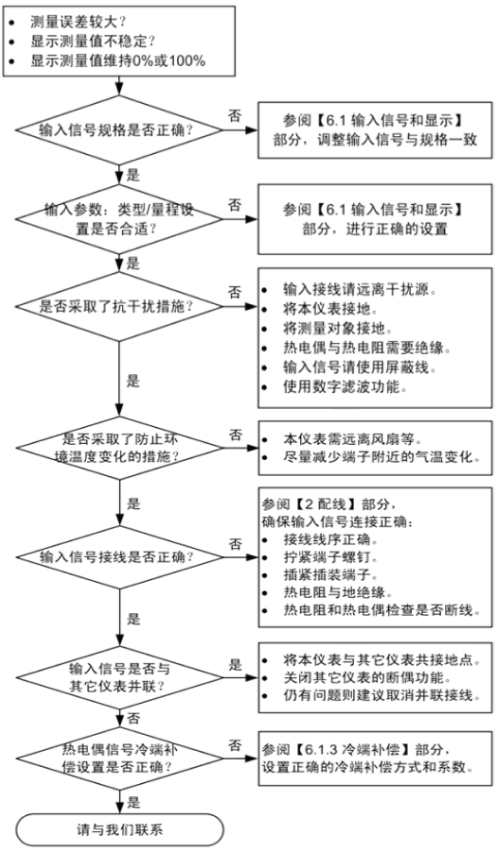 6.故障現(xiàn)象:接好電源以及信號后儀表顯示不是正常數(shù)值,顯示O.L/-O.L或者其他數(shù)值,輸入信號進入后顯示值不變化。