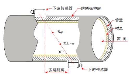 時(shí)差法:利用聲波在流體中順流傳播和逆流傳播的時(shí)間差與流體流速成正比這一原理來(lái)測(cè)量流體流量的。原理如下圖所示: