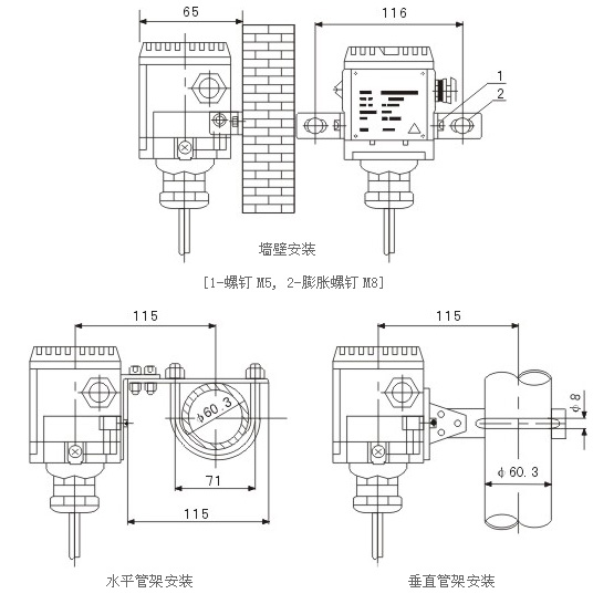 LK-LC/LR型投入式液位計(jì)變送器具有多種安裝固定方式,以適應(yīng)不同現(xiàn)場情況。當(dāng)現(xiàn)場不能夠提供G2的內(nèi)螺紋或法蘭等工藝設(shè)施時(shí),可選擇普通形式的液位變送器,它有墻壁安裝式、水平管架式和垂直管架式等叁種安裝方式可選擇,使您在現(xiàn)場安裝時(shí)得心應(yīng)手。
